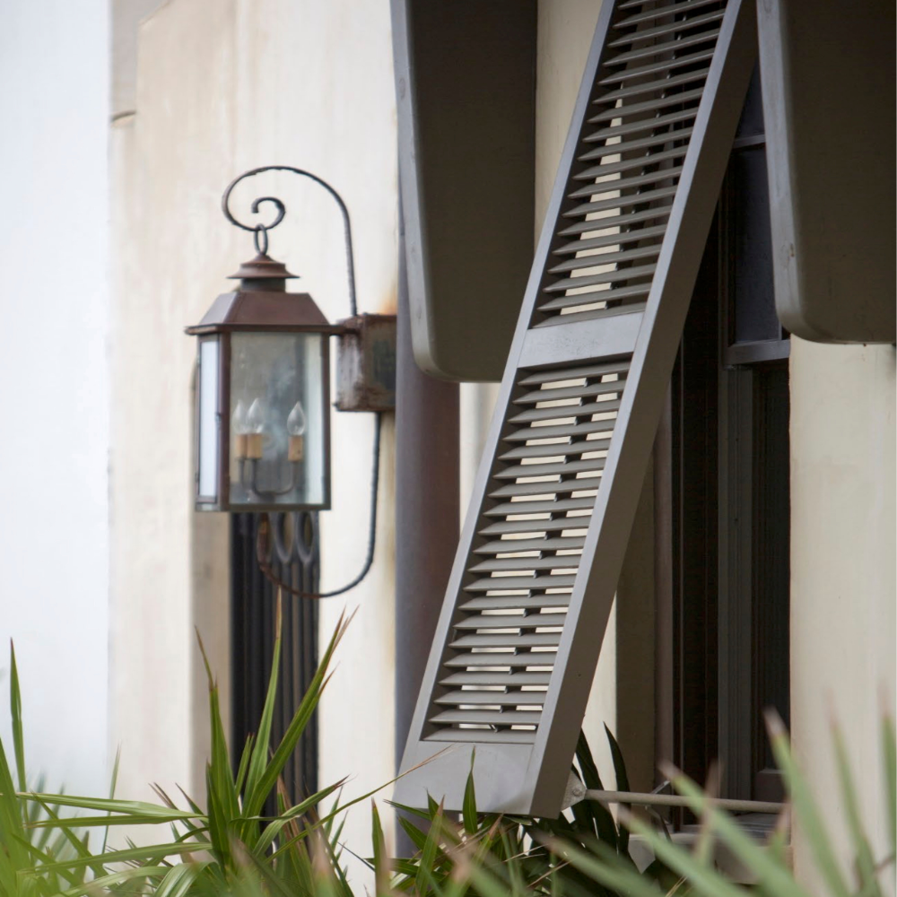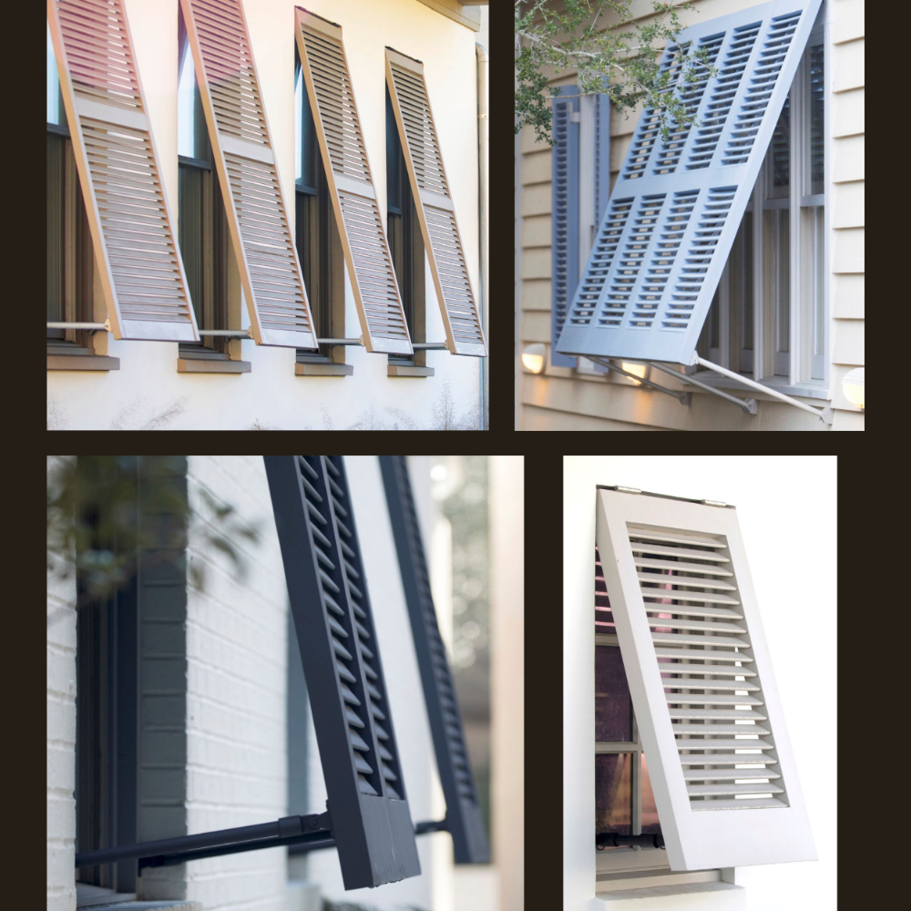 PVC Bahama/Bermuda exterior shutters can be customized to nearly any configuration - similar to wood and composite. Designed for a custom fit on a variety of exterior home surfaces. Each shutter can be mounted with heavy-duty concealed top-mounted hinges and telescoping fold-down arms to provide instant adjustments for a perfect shade angle or full storm protection.