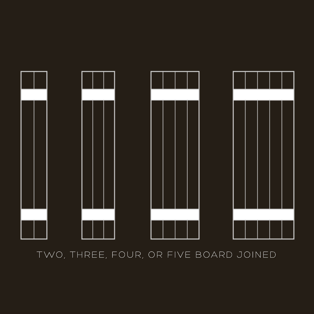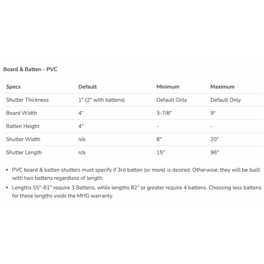 PVC Board & Batten exterior shutters can be customized to nearly any configuration - similar to wood and composite. The number of vertical boards will be based on the final width of the shutter. Contact us for specifics and a custom quote.