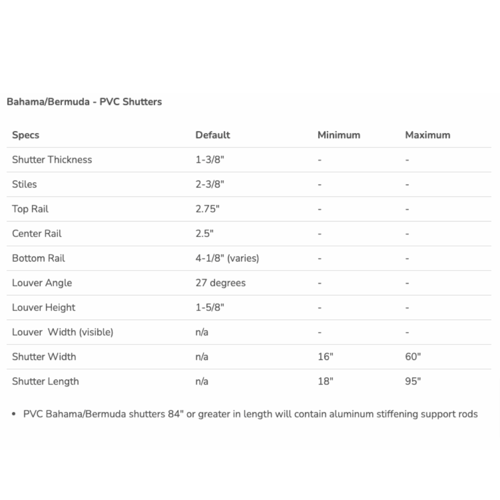 PVC Bahama/Bermuda exterior shutters can be customized to nearly any specifications - similar to wood and composite.